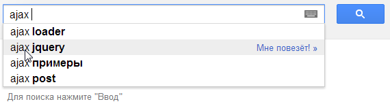 Пользователь начинает печатать поисковую фразу, а JavaScript предлагает возможные варианты, получая список самых вероятных дополнений с сервера.