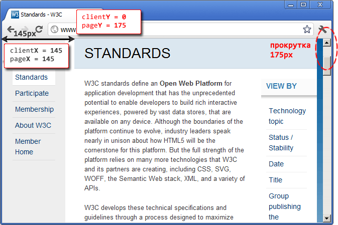 Мы будем называть координаты в ней pageX/pageY.