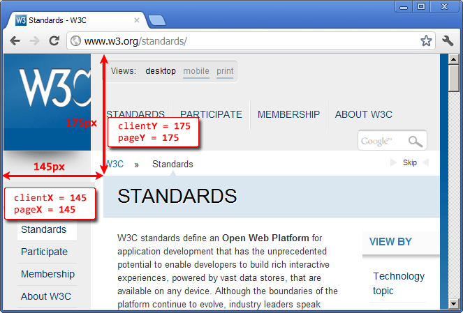 Например, координаты элемента с надписью «STANDARDS» равны расстоянию от верхней/левой границы окна: