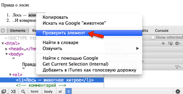 - …Либо, что обычно удобнее всего, просто кликните на нужном месте на странице правой кнопкой и выберите в меню «Проверить Элемент».