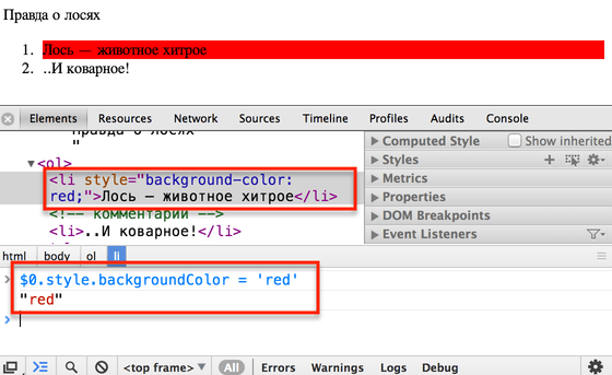 Мы выделили элемент, применили к нему JavaScript в консоли, тут же увидели изменения в браузере.