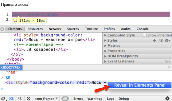 Таким образом, можно легко перемещаться из Elements в консоль и обратно.