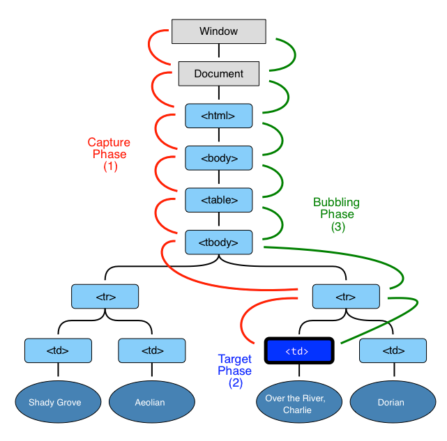 Стадия цели, обозначенная на рисунке цифрой (2), особо не обрабатывается, так как обработчики, назначаемые обоими этими способами, срабатывают также на целевом элементе.