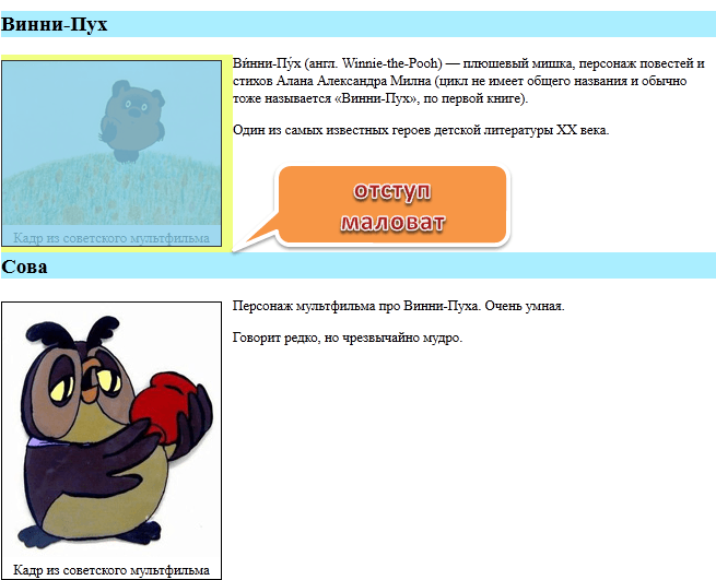 • После него идёт float-элемент – картинка «Сова». Он был сдвинут влево. Согласно алгоритму, он двигается до левой границы или до касания с другим float-элементом, что и произошло (картинка «Винни-Пух»).