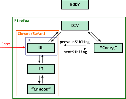 | Firefox | узел DOM | узел DOM | 1 |