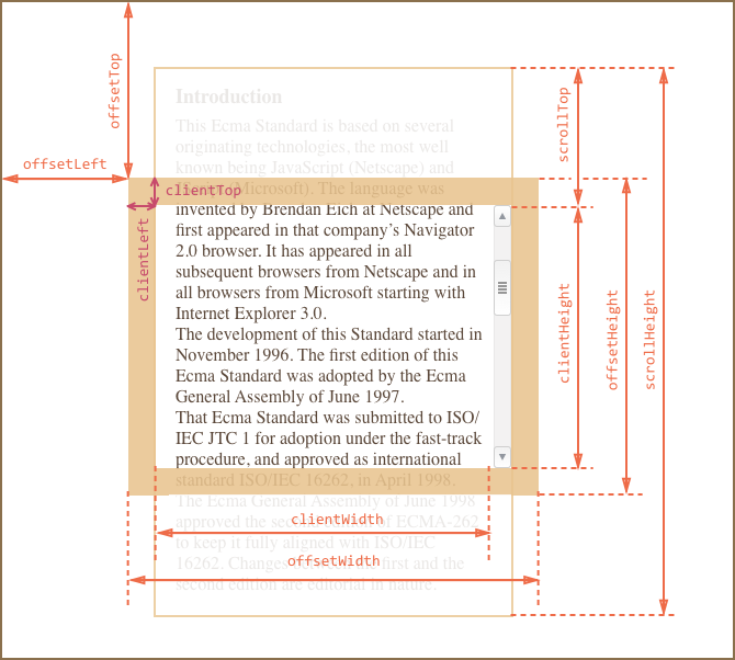 offsetParent– «родитель по дереву рендеринга» – ближайшая ячейка таблицы, body для статического позиционирования или ближайший позиционированный элемент для других типов позиционирования.offsetLeft/offsetTop– позиция в пикселях левого верхнего угла блока, относительно егоoffsetParent.offsetWidth/offsetHeight– «внешняя» ширина/высота блока, включая рамки.clientLeft/clientTop– отступ области содержимого от левого-верхнего угла элемента. Если операционная система располагает вертикальную прокрутку справа, то равны ширинам левой/верхней рамки, если же слева (ОС на иврите, арабском), тоclientLeftвключает в себя прокрутку.clientWidth/clientHeight– ширина/высота содержимого вместе с полямиpadding, но без полосы прокрутки.scrollWidth/scrollHeight– ширина/высота содержимого, включая прокручиваемую область. Включает в себяpaddingи не включает полосы прокрутки.scrollLeft/scrollTop– ширина/высота прокрученной части документа, считается от верхнего левого угла.