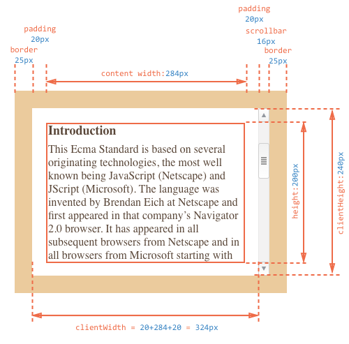 Поэтому в clientWidth входит не CSS-ширина, а реальная ширина содержимого 284px плюс левое и правое поля padding (по 20px), итого 324px.