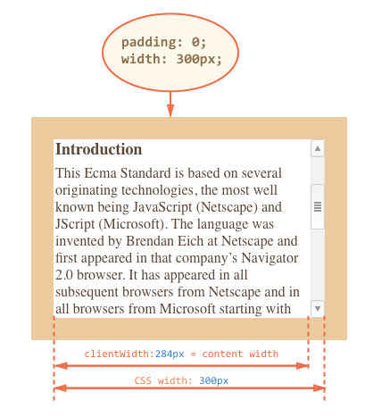 Теперь clientWidth – ширина содержимого здесь не равна CSS-ширине, её часть «съедает» полоса прокрутки.
