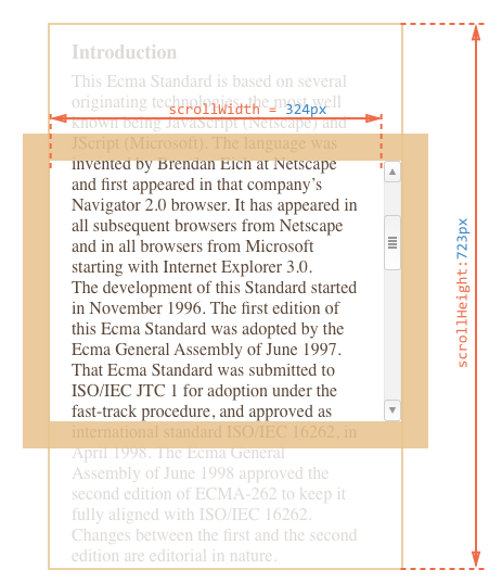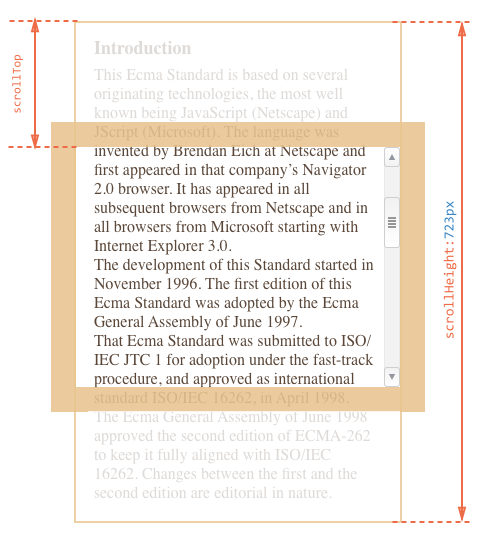 Следующая иллюстрация показывает значения scrollHeight и scrollTop для блока с вертикальной прокруткой.
